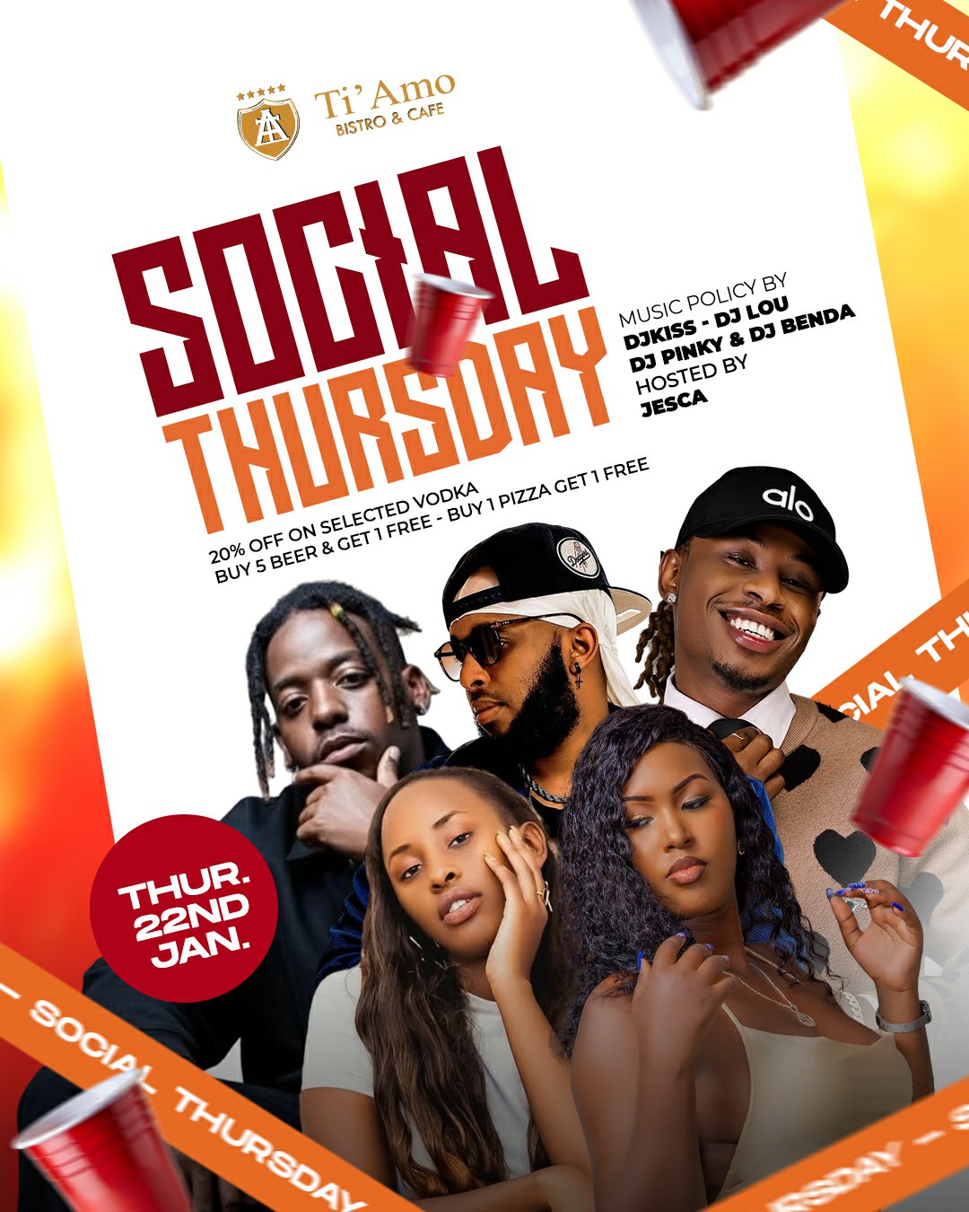 Ku wa Kane tariki ya 22 Mutarama 2026, Ti’Amo Lounge yaguteguriye igitaramo cyihariye cyiswe “SOCIAL THURSDAY”, kizaba cyuzuyemo ibyishimo n’umunezero urenze ibisanzwe. Ni ijoro rigenewe abakunda gusabana, kuruhuka no kwishimana n’inshuti n’abo bakunda.