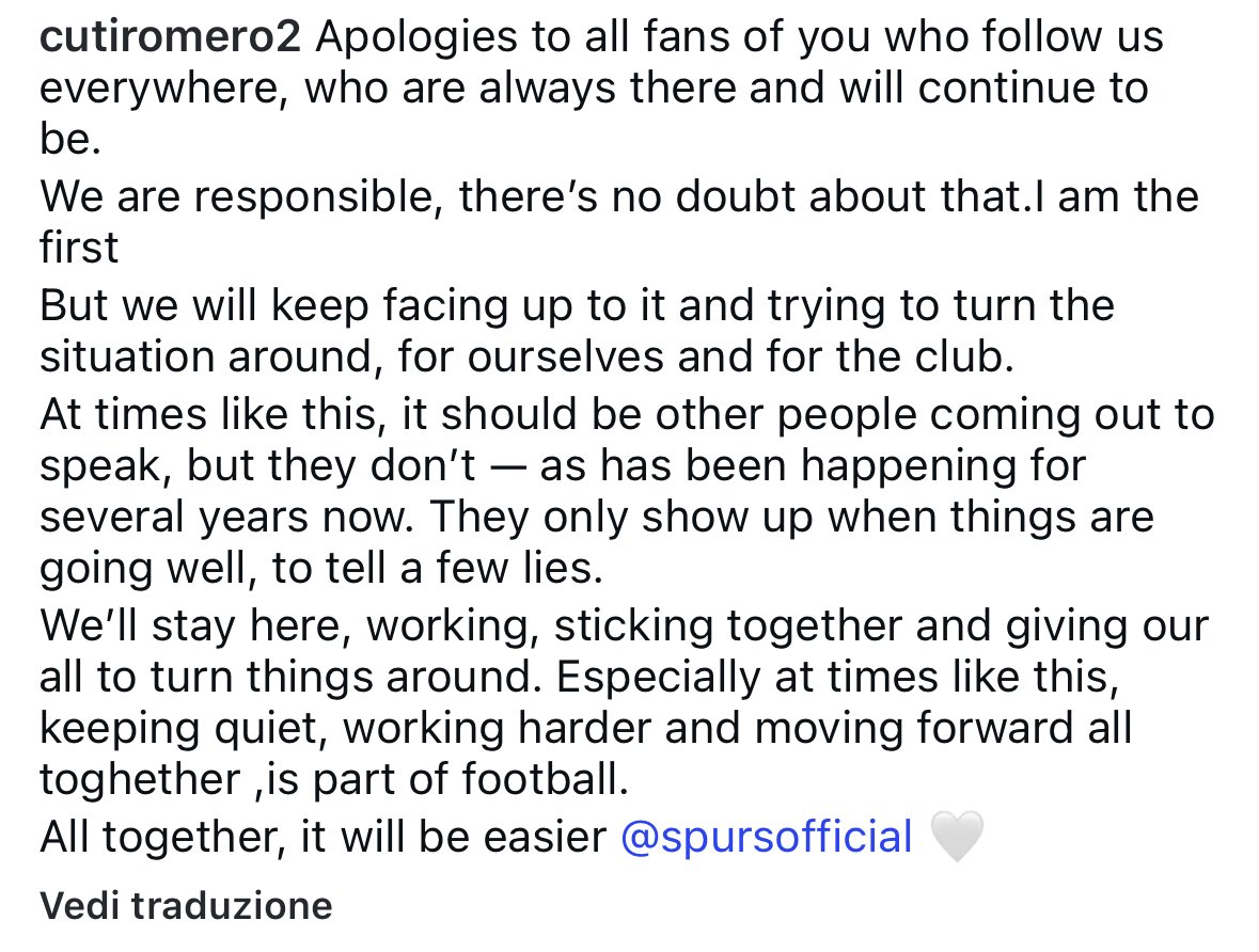 Aya magambo ya Romero aje mu gihe Tottenham iri guhura n’ibihe bitoroshye mu mikino n’imyitwarire y’ikipe muri rusange. Abafana benshi bagaragaje ko bashyigikiye uyu mukinnyi, bavuga ko ari intwari ivuze ukuri ku byo babonaga ariko batabona ubitangaza.