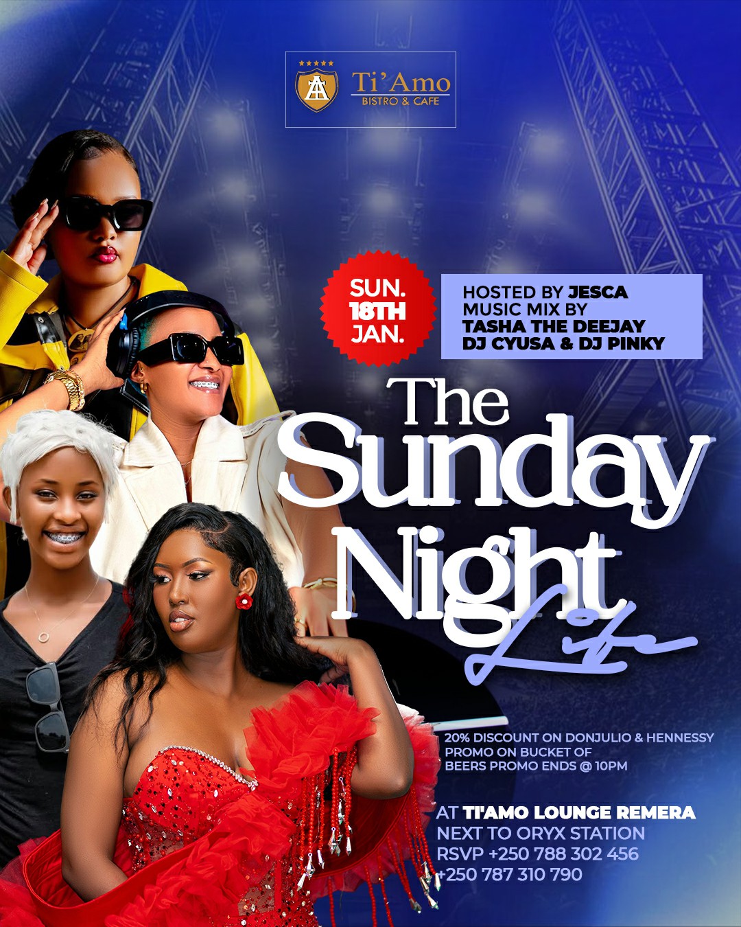 Igitaramo ni kimwe mu bintu by’ingenzi bishobora gutuma umuntu ahorana akanyamuneza, akaruhuka mu mutwe no mu mubiri, akibagirwa imihangayiko y’icyumweru. Ni muri urwo rwego, abakunzi b’imyidagaduro n’umuziki mwateguriwe igitaramo kidasanzwe cyiswe “THE SUNDAY NIGHT”, kizaba ku Cyumweru tariki 25 Mutarama 2026, mu kabari kazwiho gutanga serivisi zinoze Ti’Amo Lounge i Remera.