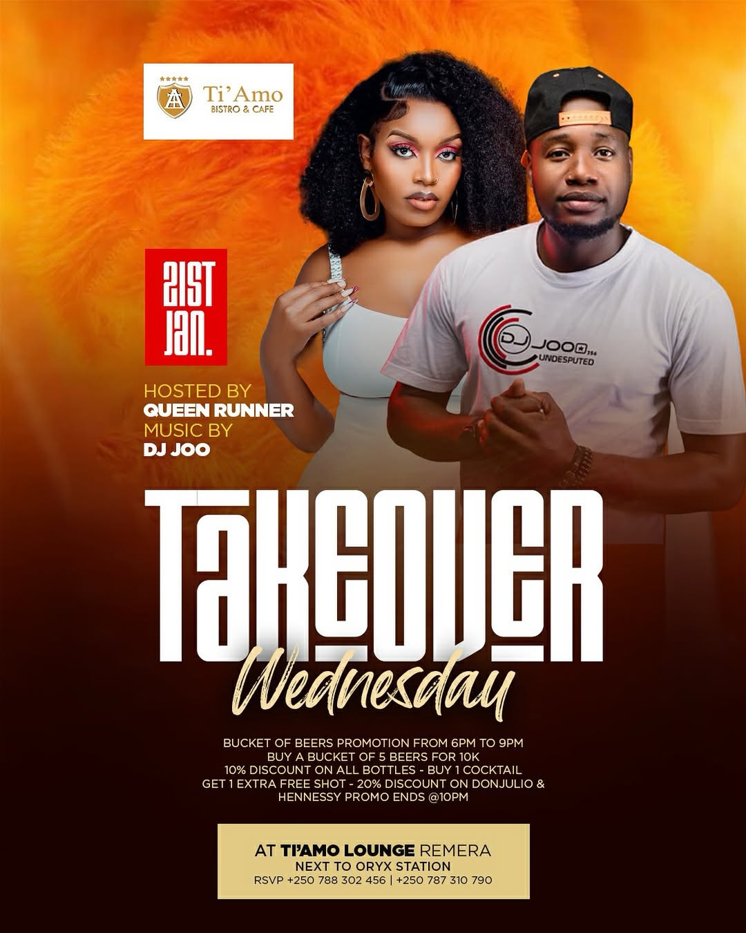 Mu Mujyi wa Kigali, ahazwi cyane mu myidagaduro nโimyemerere yโijoro rigezweho, Tiamo Lounge i Remera irongera yerekane impamvu ikomeje kuvugwa nโabatari bake. Kuri uyu wa Gatatu taliki ya 21 Mutarama 2026, hateganyijwe igitaramo kidasanzwe cyiswe TAKEOVER, kiraba ari ijoro ryo kwishimira umunsi wo kuri uyu wa Gatatu doreko Imana iba ikomeje kudutiza iminsi yo kubaho.
