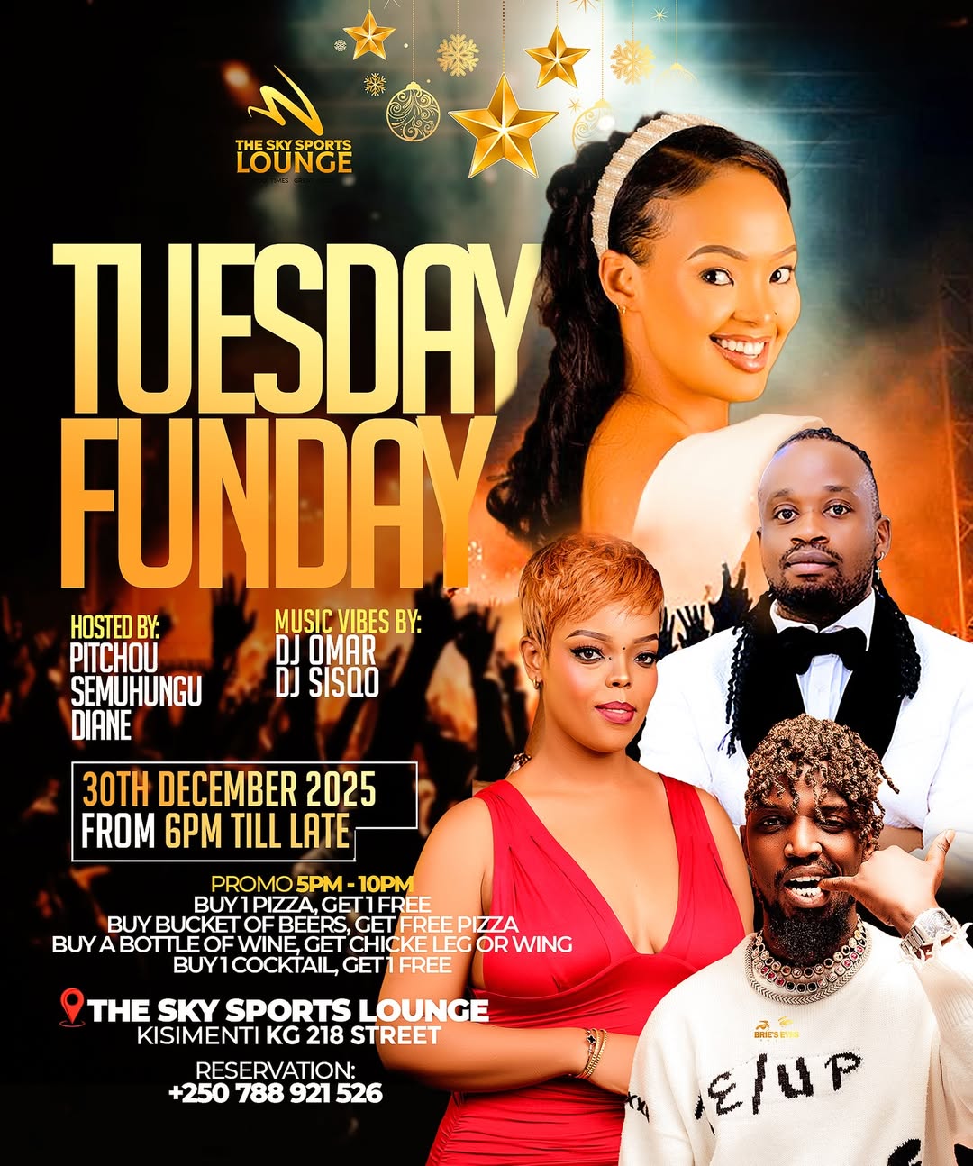 Kuri uyu wa Kabiri tariki ya 30 Ukuboza 2025, imihanda yose iraba yerekeza The Sky Sports Lounge, ahahoze hitwa The Wave Lounge, i Remera ‘Kisimenti’, KG 218 Street, mu Mujyi wa Kigali. Ni ijoro ridasanzwe ryiswe “Tuesday Funday”, rigamije guhuza abakunzi b’imyidagaduro, umuziki mu mwuka w’ibyishimo n’iminsi mikuru isoza umwaka wa 2025.