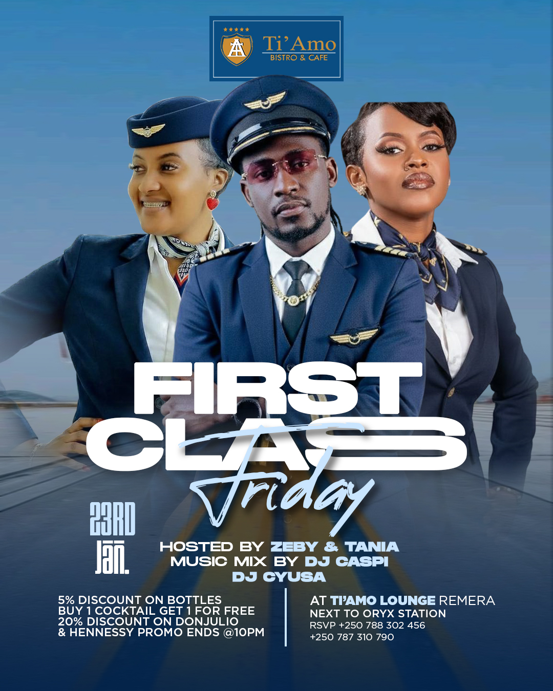 Nyuma yo kuzenguruka henshi ushaka aho waruhukira, aho wahurira n’inshuti, aho wasanga umuziki mwiza, igisubizo ntakindi ni Ti’Amo Lounge i Remera. Ku wa Gatanu taliki 23 Mutarama 2026, hateganyijwe igitaramo kidasanzwe cyiswe “FIRST CLASS”.