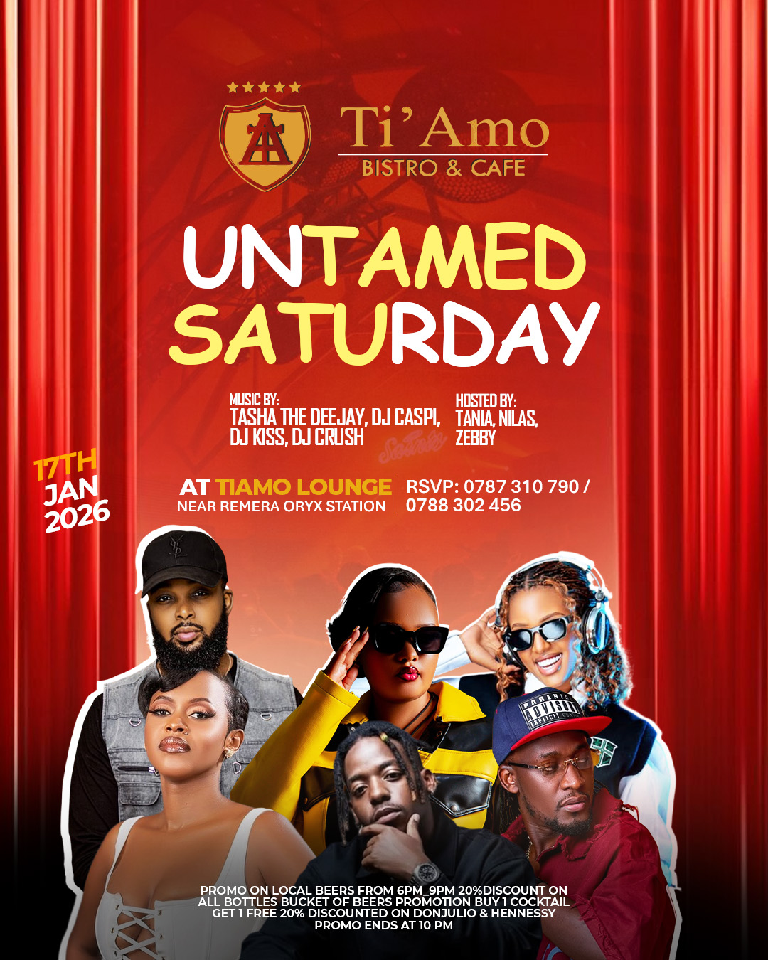 Ku wa Gatandatu tariki ya 17 Mutarama 2026, Tiamo Lounge hazaba hari igitaramo gikomeye cyiswe UNTAMED SATURDAY, kizaba cyuzuyemo, umuziki uvanze neza kandi ususurutsa abitabiriye mu buryo budasanzwe. Ni igitaramo kizahuza abakunzi b’umuziki n’imyidagaduro.